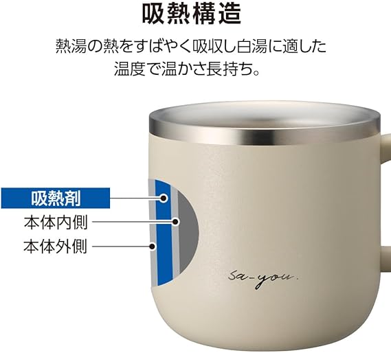 白湯専用マグではじめる温克生活。白湯専科マグカップ。95度の熱湯が2分で白湯の温度に。吸熱構造で熱湯をすばやく吸熱。