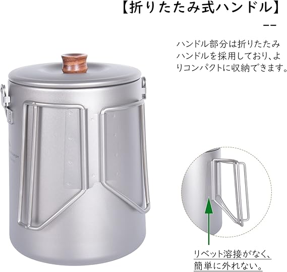 iBasingo チタンケトル マグカップ 蓋付き 折りたたみハンドル 軽量 直火OK キャンプ バーベキュー用 やかん日常使い 調理器具 収納袋付き 4点セット JP-Ti3129D)