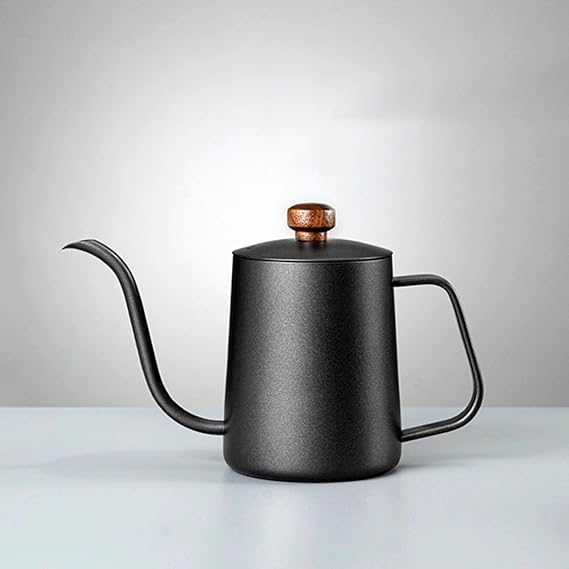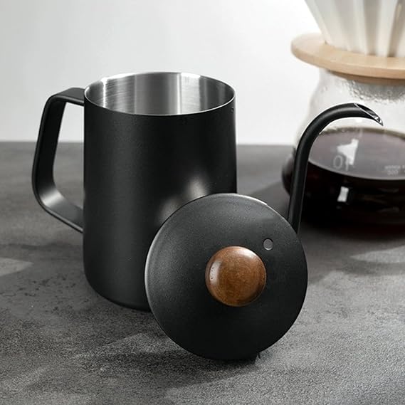 SOVIFKI コーヒーポット 直火 ドリップポット 木製の蓋 コーヒーケトル ステンレス 580ml 内に目盛り アウトドア キャンプポット ドリップ 細口 ブラック [並行輸入品]