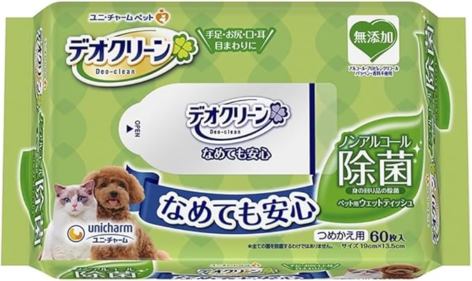 【4個セット】 デオクリーン ノンアルコール 除菌 ウェットティッシュ 詰め替え用(60枚入) 犬猫兼用オリジナルレジ袋付き なめても安心 つめかえ用