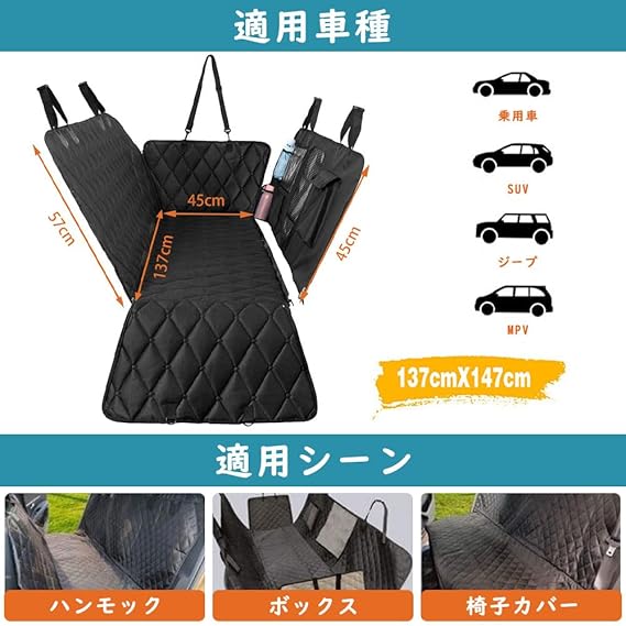 【可視メッシュ窓とポッケト付き】ペット車用シートには、メッシュ窓付きなので、空気の循環に役に立ち、後部座席もエアコンの効果がであります。その上、前席から愛犬をよくみえるから、とても安心です。また、ポケットが付いていますので、ペット用品、ティッシュなどの日常用品を置いできます。
