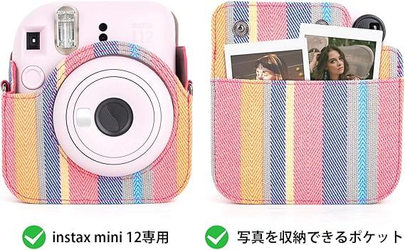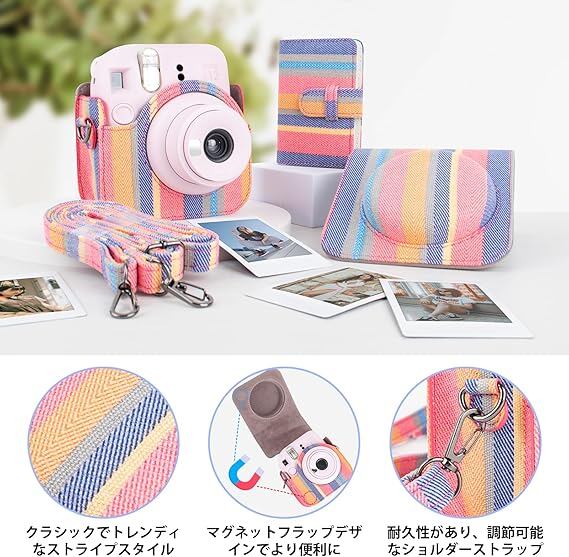 HIYQIN 「カラフルシリーズ」チェキケース instax mini 12 ケース,Fujifilm チェキ12ケース と28枚写真入れアルバム付き2点セット チェキ mini 12カメラケース ショルダーストラップ付き PUレザー -カラーストライプ