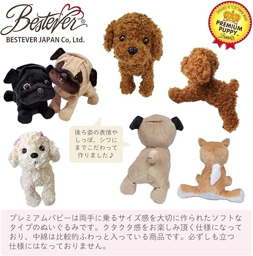 ベストエバージャパンが自信をもってお届けする、その技術と表現力を存分に発揮したプレミアムパピー。手足の先にはビーズ、そしてそれぞれの犬種にぴったりあった最高の手触りの生地を使用。前から見ても、横から、後ろから見てもカワイイパピーです。