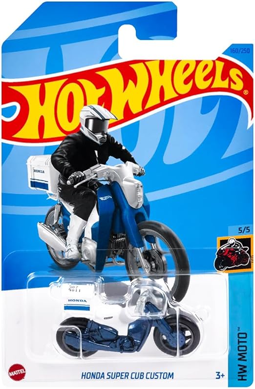 【内容】1958年に登場したホンダの小型オートバイ、スーパーカブ。アメリカでは1964年にビーチボーイズがスーパーカブを題材にした「Little Honda」という歌を発表したことでも知られるが、現在も世界中で愛される1台がホットウィール化。日本でもお馴染みの原付版ではなく強力なエンジンを搭載するC125をモチーフとしている。キックスタンドとキャリアが付いていて、自立出来る仕様になっている。