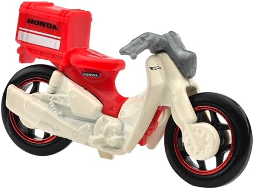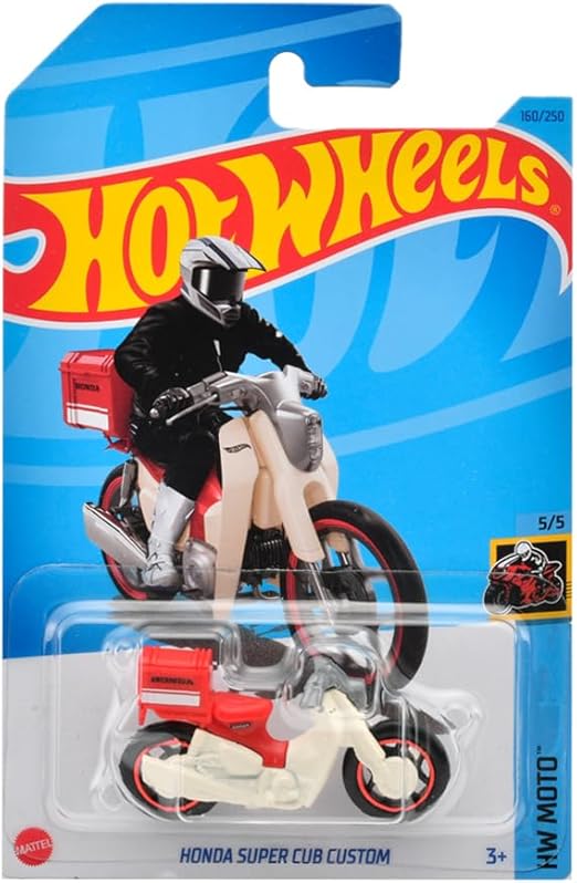 【内容】1958年に登場したホンダの小型オートバイ、スーパーカブ。アメリカでは1964年にビーチボーイズがスーパーカブを題材にした「Little Honda」という歌を発表したことでも知られるが、現在も世界中で愛される1台がホットウィール化。日本でもお馴染みの原付版ではなく強力なエンジンを搭載するC125をモチーフとしている。キックスタンドとキャリアが付いていて、自立出来る仕様になっている。