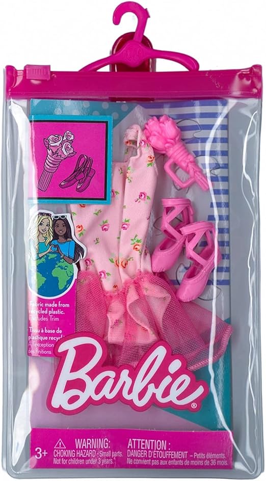 【内容】バレエダンサーがパフォーマンスをするようなかわいいピンクのバレエドレスとシューズと花束が含まれているァッションセット。バービーのおしごとファッションは、お子さまが想像力を働かせて、いろいろなキャリアストーリーを夢見ることができます。リサイクルプラスチックの生地使用。ポーチとして使えるビニールパッケージに入っています。