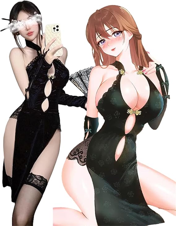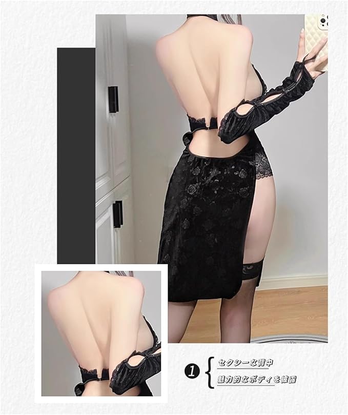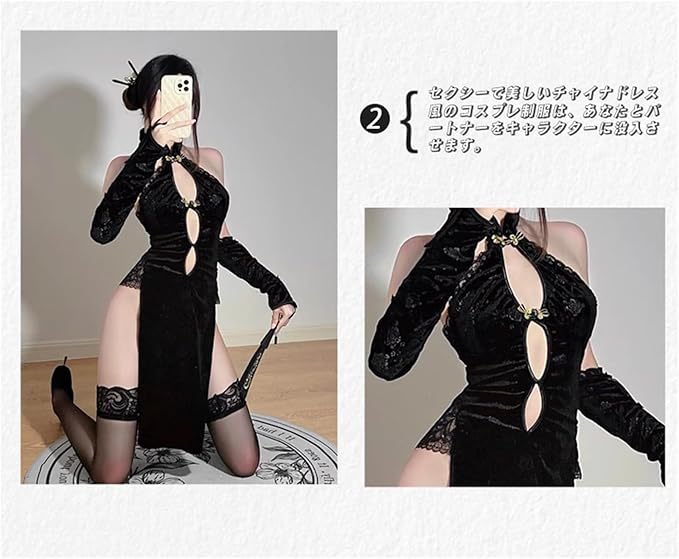 [ssetoy] チャイナ服 フルセット チャイナドレス セクシー コスプレ 2点セット (ベビードール/Tバック/手袋*2) (黒) ランジェリー レディース ワンピース スリット ロング コスチューム 刺繍 可愛い コスプレ Tバック付きレディース 衣装 女性用 レディー 人気 cosplay 4点セット