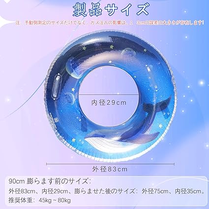 【浮き輪サイズ】①90cmサイズ 膨張前:外径83cm、内径29cm 膨張後:外径75cm、内径35cm外径75cm、内径35cm。 大人も子供も使用でき、ビーチ、プール、ウォーターアクティビティ、ビーチなどに適しており、完璧な夏を過ごすことができる!