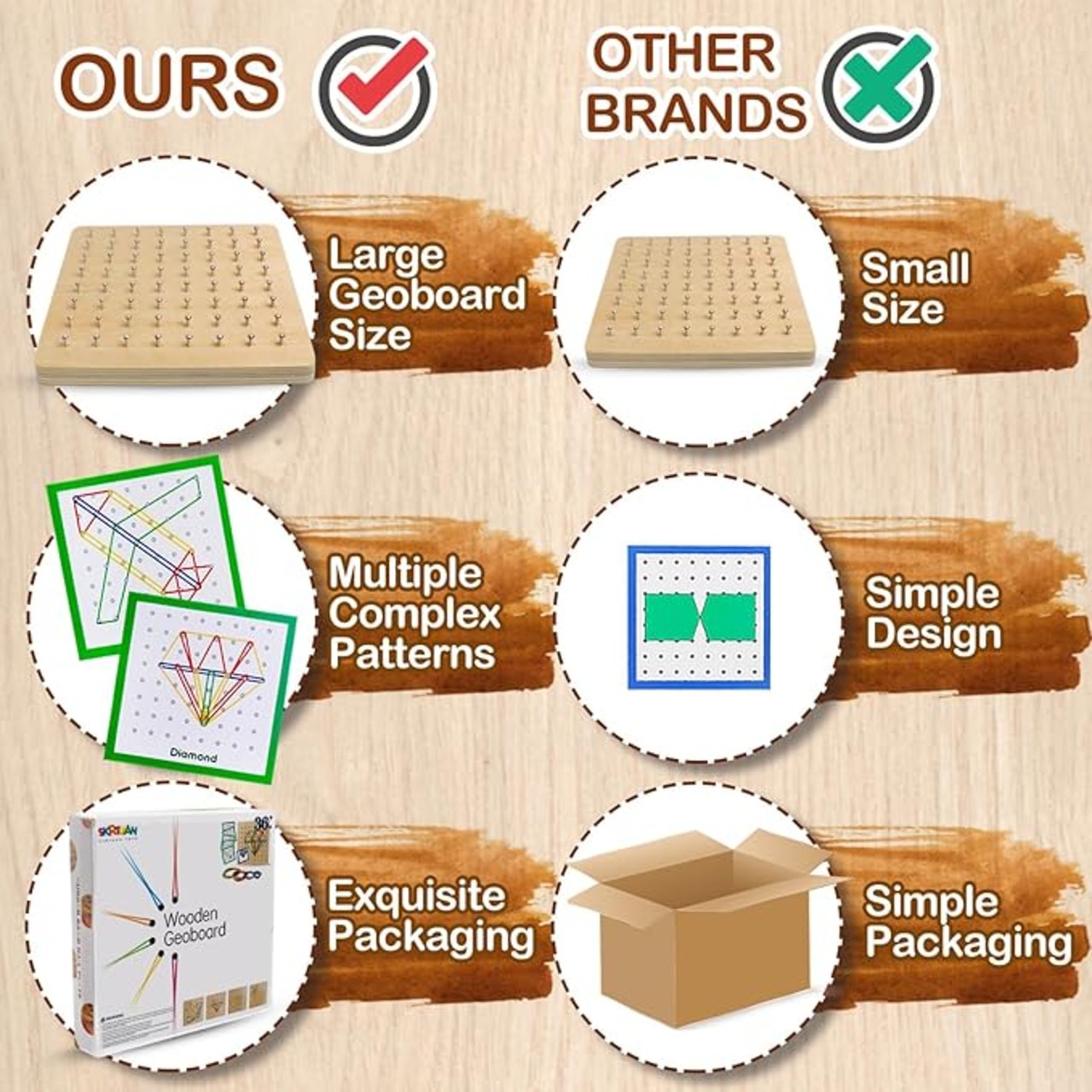 幾何学的なボード:この木製ジオボードには、64個の釘、24枚のパターンカード(空のカード5枚、幾何学的なカード19枚を含む)、ラテックスバンドパックが付属しており、無限の創造的な遊びに必要なすべてを提供します。 ボードのサイズは7 x 7 x 0.6インチで、重さは12オンスで、多用途で持ち運び可能な学習ツールです。
