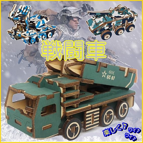戦闘車 子供の興味を引く木製の組み立て式立体パズル。頭をフルに働かせて作り上げることで、創造力、集中力、根気強さなど脳を刺激してくれます。夢中になること間違いなし!完成後は色をつけたりしてお楽しみ下さい。お部屋のインテリアとしてもgood ♪