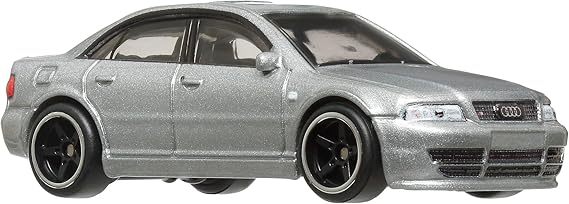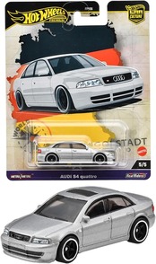 【内容】1994年、大成功を収めた80シリーズの後継車種として登場したA4。同車はアウディのアッパーミドルクラスのセダンでエンジンは1.6および1.8リッターの直4、2.8リッターのV6他が搭載された。同車をベースにエンジンの高出力化やサスペンションの強化を行ったのがホットウィールがモチーフにした2代目S4で1997年に登場している。S4はセダンとステーションワゴンの2タイプが用意され、後者はS4アヴァントと呼ばれた。エンジンは265馬力を発生するV6 DOHC 2.7リッター・ツインターボエン