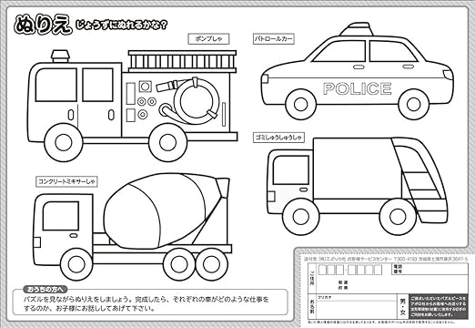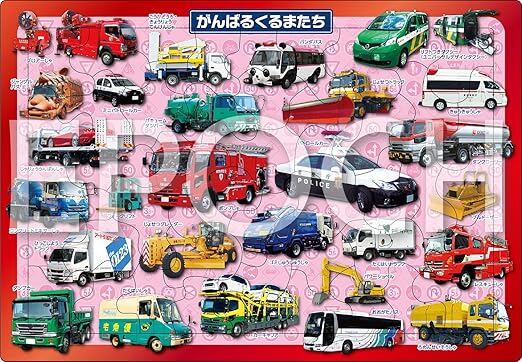 パトカーや消防車など、27種類の自動車が掲載されたパズルです。