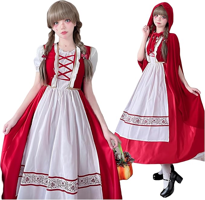 [JUNDOMECY] ハロウィン コスプレ 赤ずきん 大人 レディース 豪華 可愛い 赤ずきんちゃんコスチューム 大きいサイズ 赤ずきん風 衣装 マント ワンピース エプロン 童話 キャラクター 仮装 パーティー イベント 文化祭 舞台 演出服 Halloween cosplay