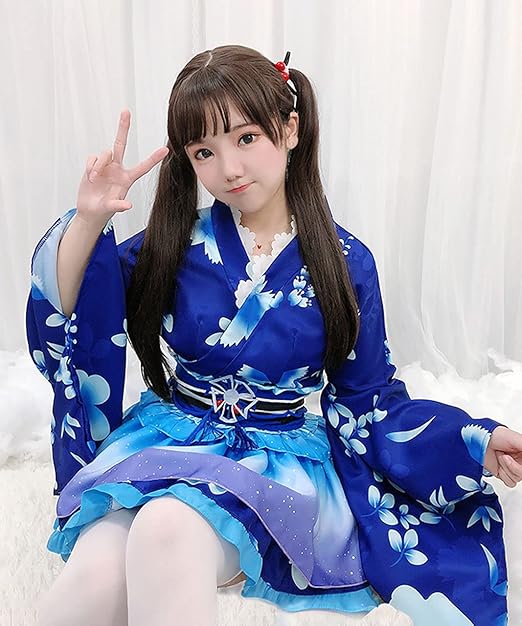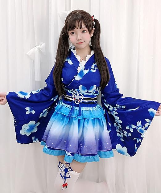 [milky time] 浴衣 和風 ミニスカ 可愛い コスプレ ハロウィン コスチューム セット 夏祭り 花魁 (ブルー)