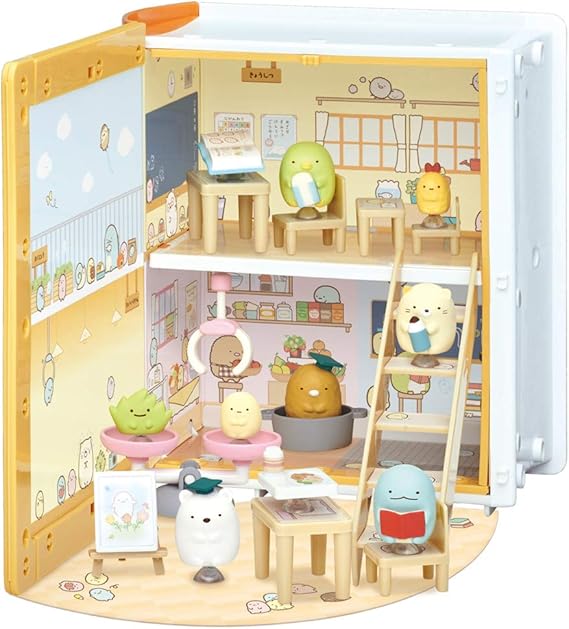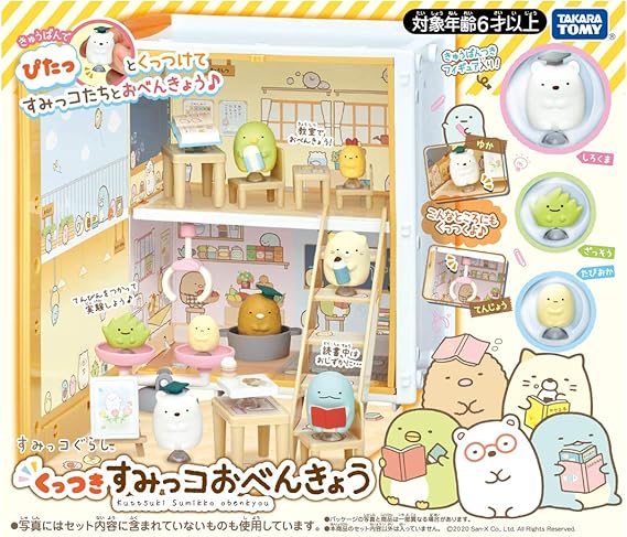 付属品:おべんきょう本体(1),階段(1),扉止めパーツ(1),てんびん(1),机(すみっコ用)(2),イス(すみっコ用)(2),机(みにっコ用)(1),イス(みにっコ用)(1),イーゼル(1),キャンバス(1),あげものナベ(1),本(1),給食プレート(1),アーム(1),しろくまフィギュア(吸盤付き)(1),ざっそうフィギュア(吸盤付き)(1),たぴおかフィギュ