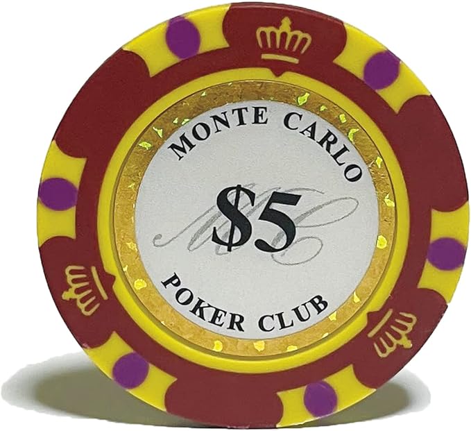 チップサイズは約:直径40mm×厚さ3.4mm、重さ14g (各20枚 1$、5$、25$、50$、100$)