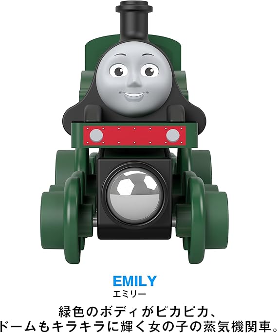 【内容】緑色のボディがピカピカ、ドームもキラキラに輝く女の子の蒸気機関車です。きかんしゃトーマスの木製シリーズは、そのぬくもりあふれる手触りと丈夫な作りで世界中の小さな子供たちから愛され続けています。エミリーと一緒に冒険を繰り広げよう。 2022 Gullane (Thomas) Limited.