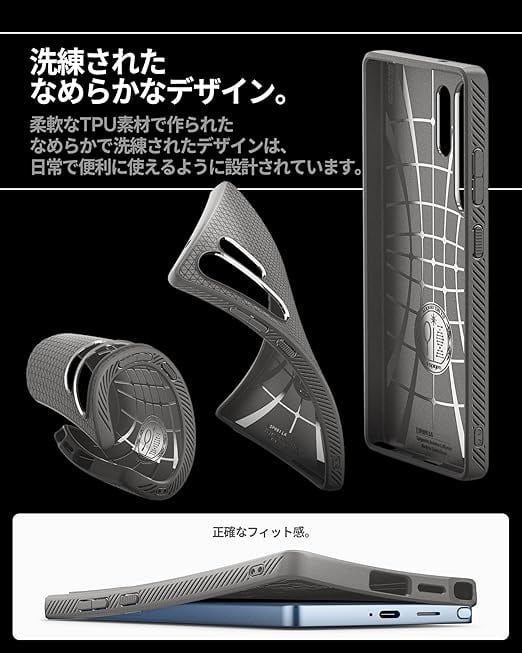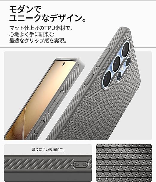 【高耐久のマット素材】マットな仕上げとジオメトリックなパターンが魅力的なリキッド・エア。装脱着が簡単になる柔らかいTPU(熱可塑性ポリウレタン)素材に衝撃を吸収するエアクッションを適用し、極めた保護力でデバイスを守ります