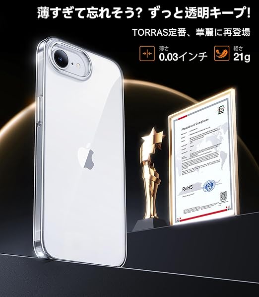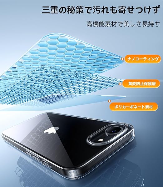 【99%の透明度を誇る】表層にはTORRASが独自に研究開発したナノコーティングを施している。この技術により、iPhone 16e 用 ケース本体は前代未聞の耐黄変能力を備えて